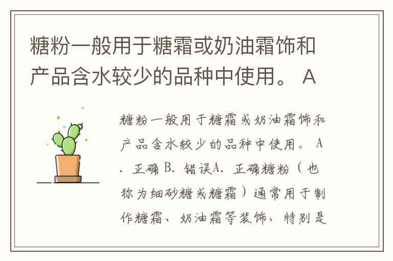 糖粉一般用于糖霜或奶油霜饰和产品含水较少的品种中使用。 A. 正确 B. 错误