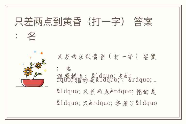温馨提示:“点”指的是“、”。“只差两点”指的是“只”字差了“两个点(、、)”为“口”字。“黄昏”义扣“夕”。口+夕=名。