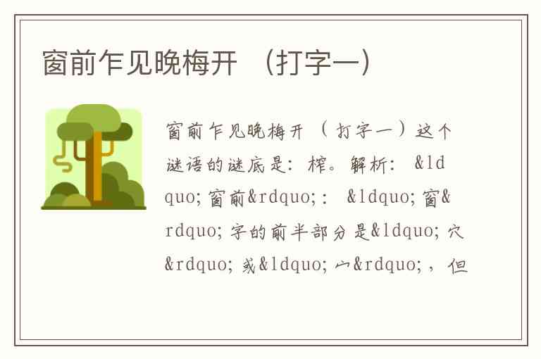 另一种思路:“窗前”扣“宀”(象形窗),“乍见”扣“乍”,“晚梅开”扣“木”(梅为木本植物),组合为“榨”(“宀”+“乍”+“木”?不通)。