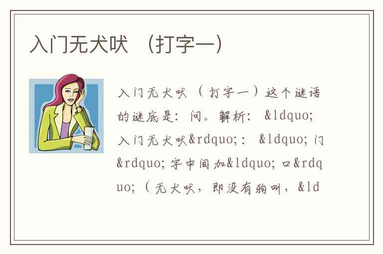 解析: “入门无犬吠”: “门”字中间加“口”(无犬吠,即没有狗叫,“吠”字由“口”和“犬”组成,无“犬”则剩“口”)。