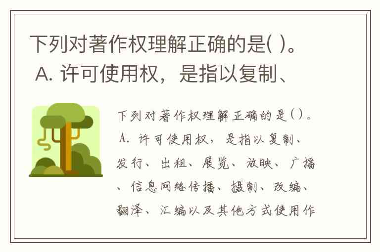 A. 许可使用权:指著作权人允许他人以特定方式使用作品的权利,包括复制、发行、出租、展览、放映等方式。符合著作权法的规定,因此是正确的。