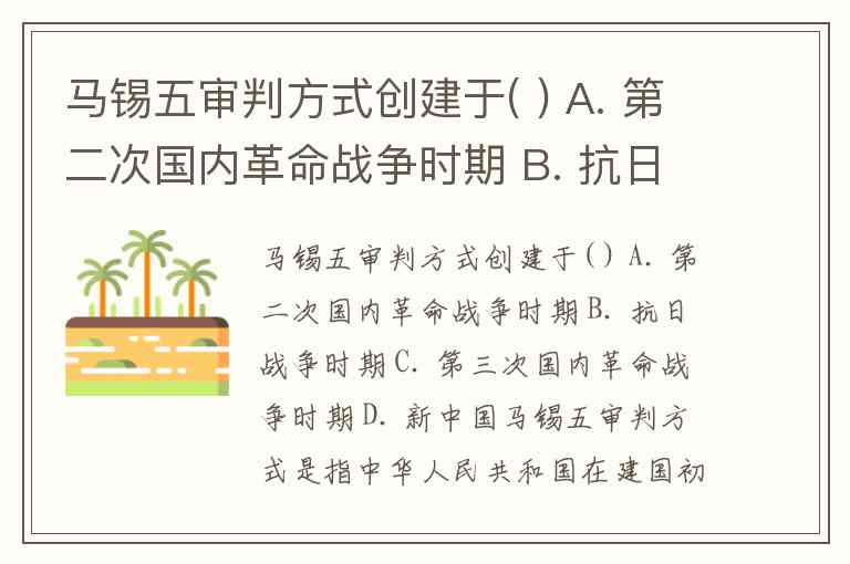 马锡五审判方式创建于( ) A. 第二次国内革命战争时期 B. 抗日战争时期 C. 第三次国内革命战争时期 D. 新中国