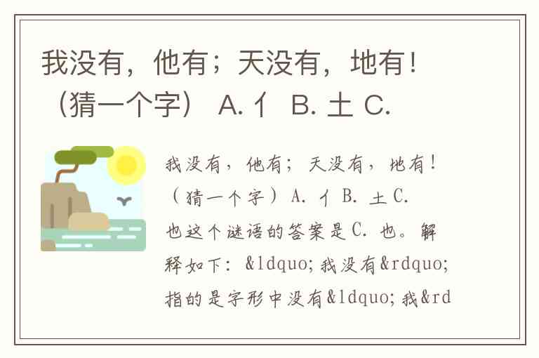 我没有,他有;天没有,地有!(猜一个字) A. 亻 B. 土 C. 也
