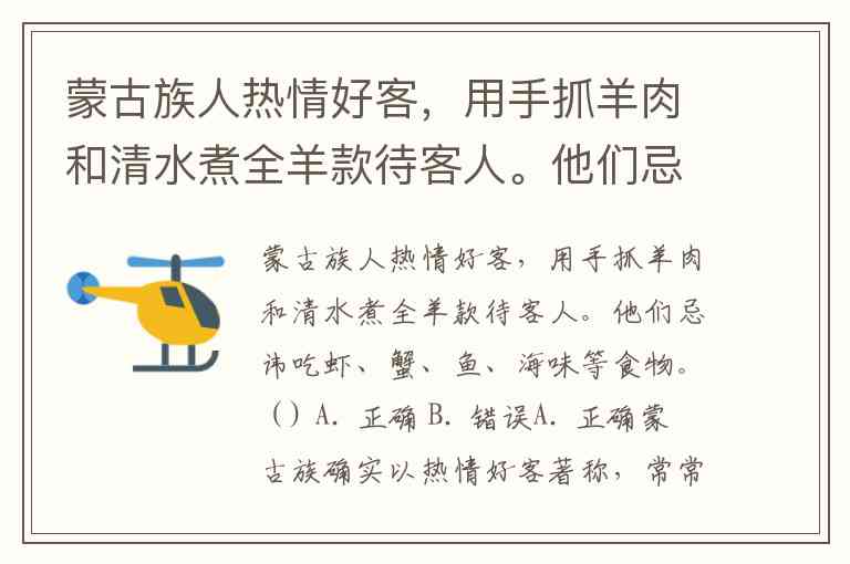 蒙古族人热情好客,用手抓羊肉和清水煮全羊款待客人。他们忌讳吃虾、蟹、鱼、海味等食物。 ( ) A. 正确 B. 错误