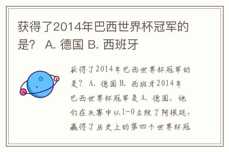 获得了2014年巴西世界杯冠军的是? A. 德国 B. 西班牙