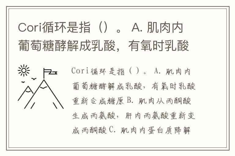 Cori循环(也叫乳酸循环)是指肌肉内通过无氧酵解产生乳酸,乳酸通过血液循环到达肝脏,在肝脏中通过糖异生过程转化为葡萄糖,再通过血液回到肌肉供能的过程。