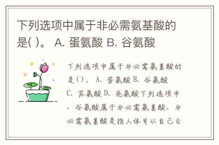 下列选项中属于非必需氨基酸的是( )。 A. 蛋氨酸 B. 谷氨酸 C. 苏氨酸 D. 亮氨酸