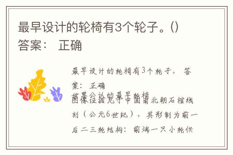 最早设计的轮椅有3个轮子。() 答案: 正确