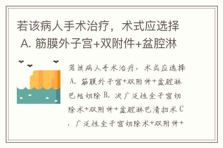 若该病人手术治疗,术式应选择 A. 筋膜外子宫+双附件+盆腔淋巴结切除 B. 次广泛性全子宫切除术+双附件+盆腔淋巴清扫术 C. 广泛性全子宫切除术+双附件+盆腔淋巴清扫术 D. 次广泛全子宫切除术+双附件+盆腔淋巴清扫术 E. 宫颈广泛切除术+盆腔淋巴结清扫术