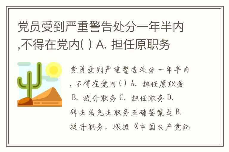 党员受到严重警告处分一年半内,不得在党内( ) A. 担任原职务 B. 提升职务 C. 担任职务 D. 辞去或免去职务