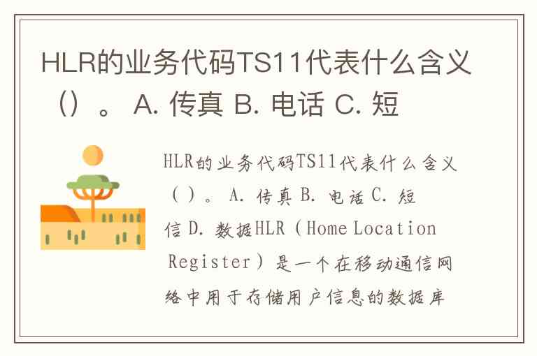 HLR(Home Location Register)是一个在移动通信网络中用于存储用户信息的数据库,它主要用于处理和管理关于移动用户的相关信息。业务代码是HLR中用来标识不同类型服务的标识符。