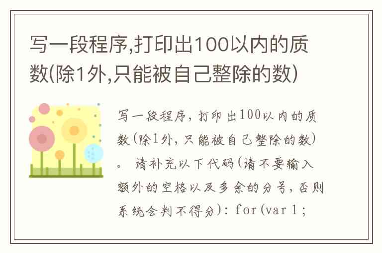 写一段程序,打印出100以内的质数(除1外,只能被自己整除的数)。 请补充以下代码(请不要输入额外的空格以及多余的分号,否则系统会判不得分): for(var 1 ;num<=100;num++){ var flag=1; for(var 2 ;i<=Math.sqrt(num);i++){ if( 3 ){ flag=0; 4 ; //结束循环 } } if( 5 ){ console.log(num); } }