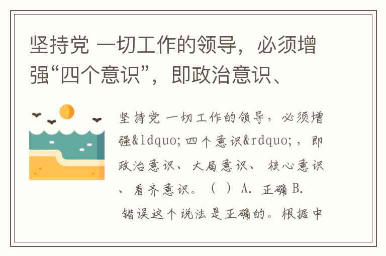 坚持党 一切工作的领导,必须增强“四个意识”,即政治意识、大局意识、 核心意识、看齐意识。( ) A. 正确 B. 错误
