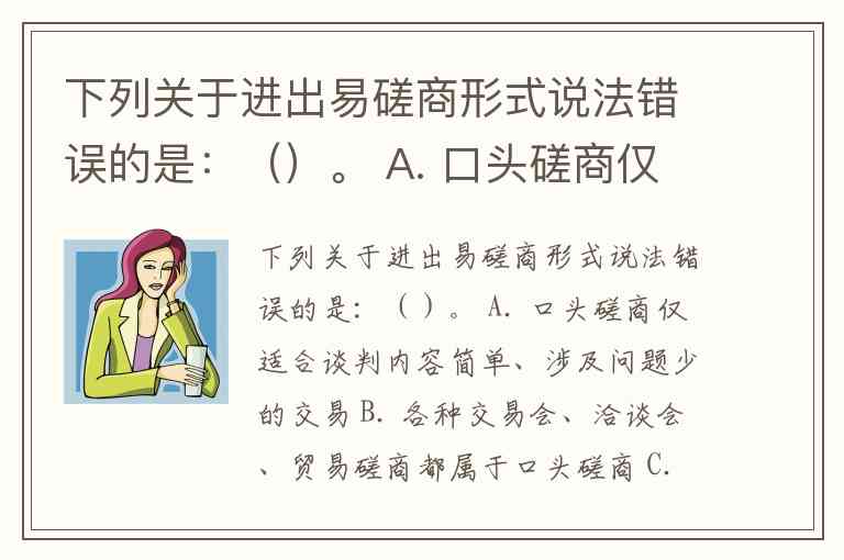 下列关于进出易磋商形式说法错误的是:()。 A. 口头磋商仅适合谈判内容简单、涉及问题少的交易 B. 各种交易会、洽谈会、贸易磋商都属于口头磋商 C. 书面磋商是指通过信件、电报、传真、计算机网络等通信方式来洽谈交易 D. 使用电子邮件磋商交易也属于书面磋商