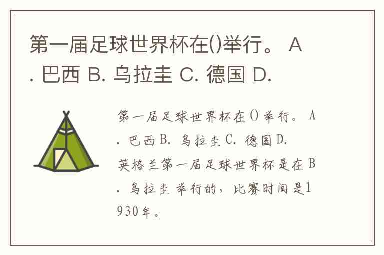 第一届足球世界杯在()举行。 A. 巴西 B. 乌拉圭 C. 德国 D. 英格兰