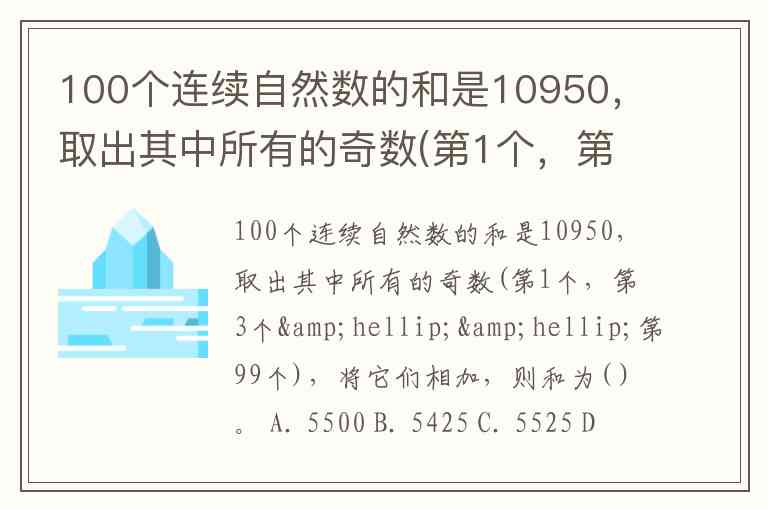 100个连续自然数的和是10950,取出其中所有的奇数(第1个,第3个……第99个),将它们相加,则和为( )。 A. 5500 B. 5425 C. 5525 D. 5450