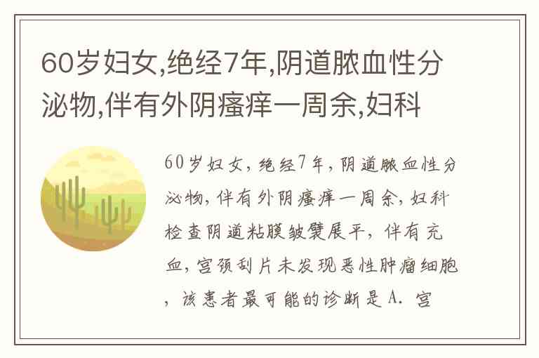 患者基本情况:60岁妇女,绝经7年,阴道脓血性分泌物,伴有外阴瘙痒超过一周。