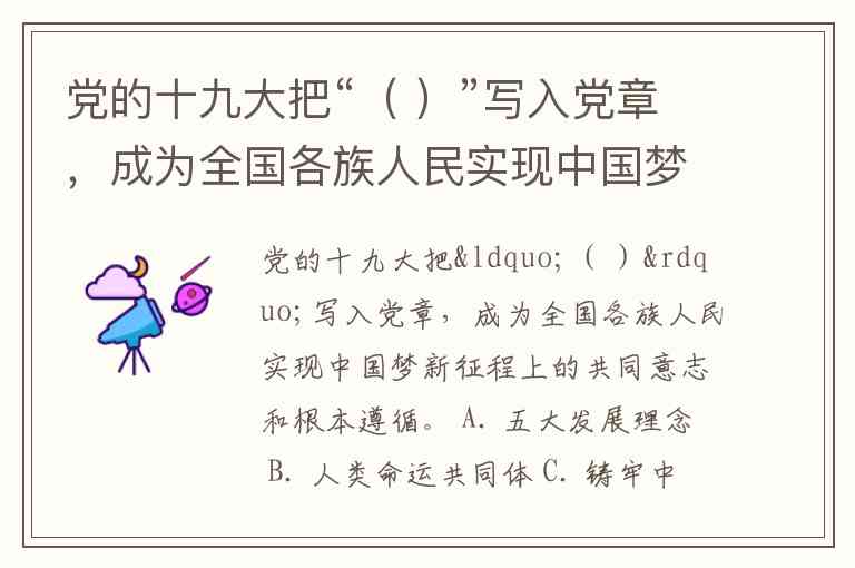 党的十九大把“( )”写入党章,成为全国各族人民实现中国梦新征程上的共同意志和根本遵循。 A. 五大发展理念 B. 人类命运共同体 C. 铸牢中华民族共同体意识 D. 国家文化软实力