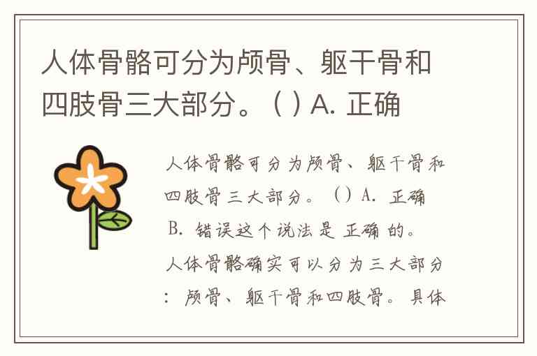 人体骨骼可分为颅骨、躯干骨和四肢骨三大部分。 ( ) A. 正确 B. 错误