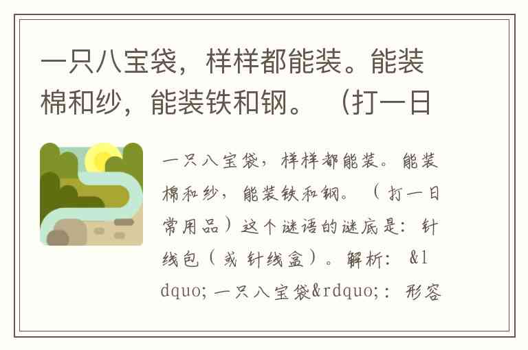 一只八宝袋,样样都能装。能装棉和纱,能装铁和钢。 (打一日常用品)