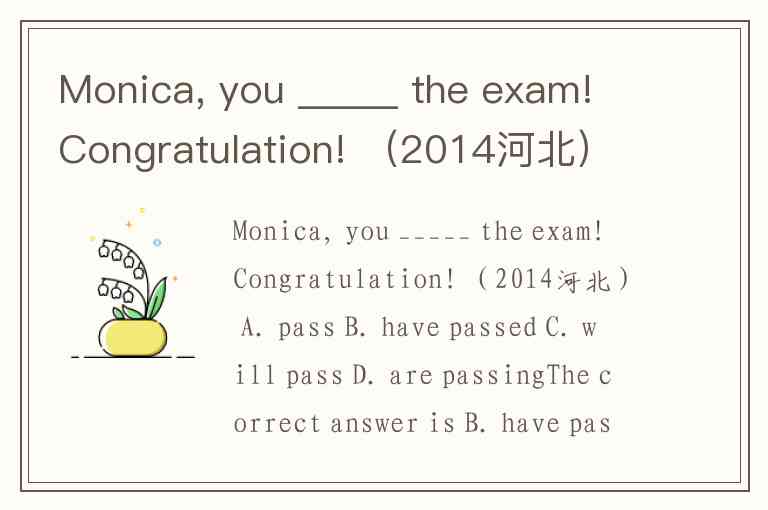 Monica, you _____ the exam! Congratulation! (2014河北) A. pass B. have passed C. will pass D. are passing