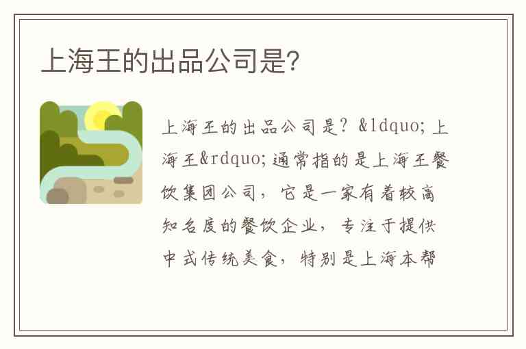 “上海王”通常指的是上海王餐饮集团公司,它是一家有着较高知名度的餐饮企业,专注于提供中式传统美食,特别是上海本帮菜。这个品牌旗下经营着许多餐饮品牌,包括一些高端餐厅和本地特色小吃。其标志性的菜肴有上海本帮菜如小笼包、红烧肉、油爆虾等。