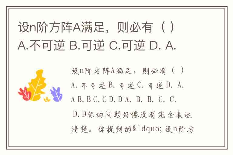 你的问题好像没有完全表达清楚。你提到的“设n阶方阵A满足”,后面的内容好像有一些遗漏,或者是排版问题。能否提供完整的条件和选项呢?这样我才能更好地帮你解答。