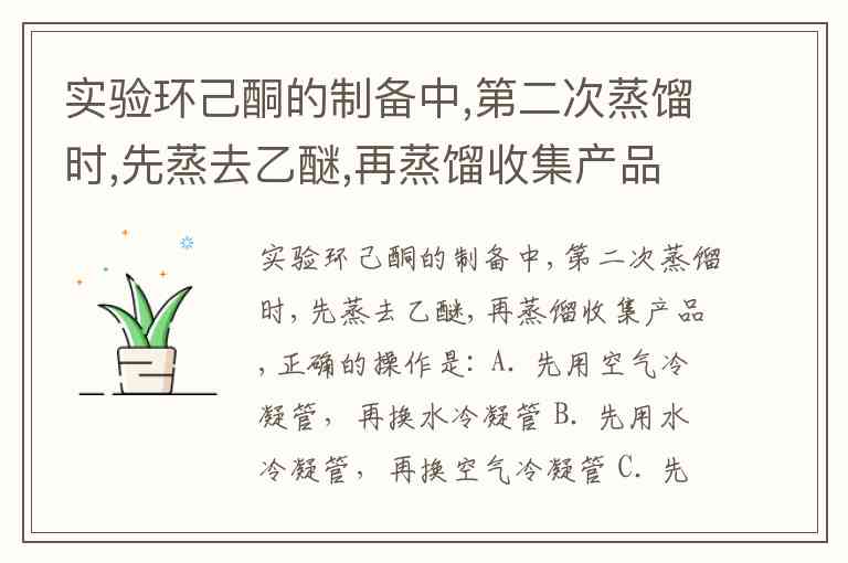 实验环己酮的制备中,第二次蒸馏时,先蒸去乙醚,再蒸馏收集产品,正确的操作是: A. 先用空气冷凝管,再换水冷凝管 B. 先用水冷凝管,再换空气冷凝管 C. 先用球形冷凝管,再换直型冷凝管 D. 先用直型冷凝管,再换球形冷凝管