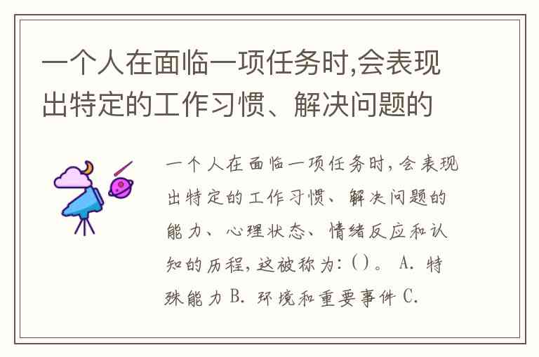 一个人在面临一项任务时,会表现出特定的工作习惯、解决问题的能力、心理状态、情绪反应和认知的历程,这被称为:( )。 A. 特殊能力 B. 环境和重要事件 C. 学习经验 D. 任务取向的技能