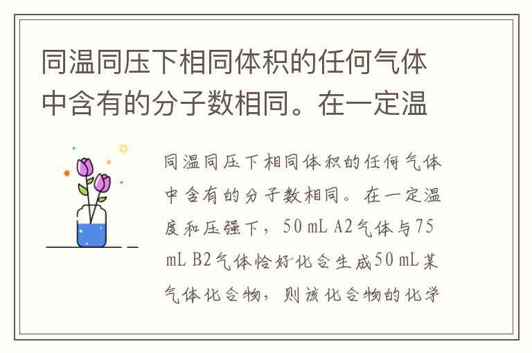 同温同压下相同体积的任何气体中含有的分子数相同。在一定温度和压强下,50 mL A2气体与75 mL B2气体恰好化合生成50 mL某气体化合物,则该化合物的化学式为( ) A. B2 B. AB C. A3B D. A2B3