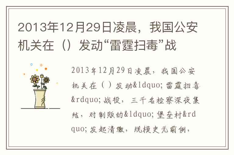 这个问题考察的是中国公安机关的反毒品行动。2013年12月29日凌晨,我国公安机关在云南德宏发动了“雷霆扫毒”战役。