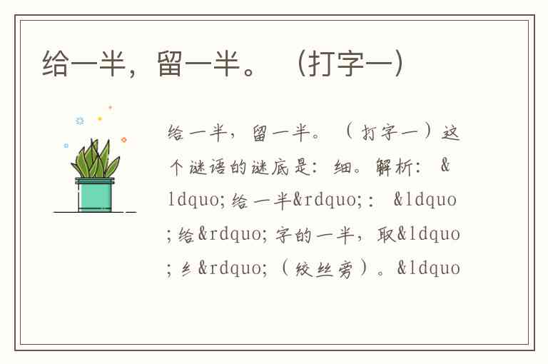 因此,“给一半,留一半”=“给”的左半“纟”+“留”的右半“田”=“细”。