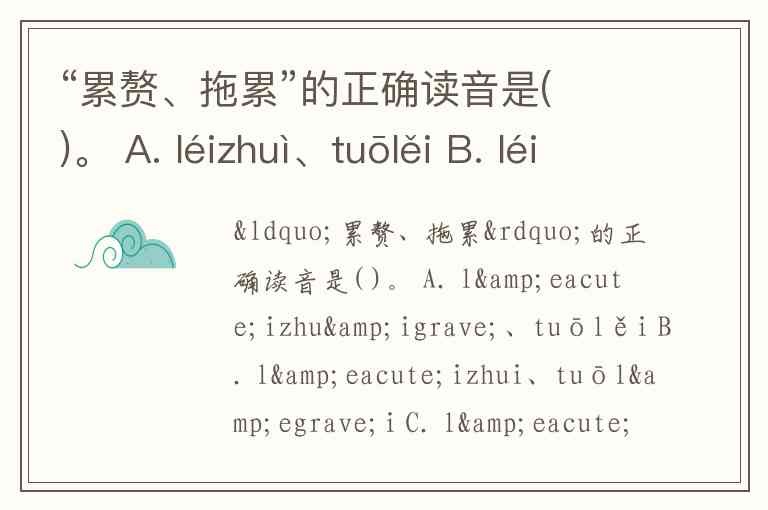 “累赘、拖累”的正确读音是( )。 A. léizhuì、tuōlěi B. léizhui、tuōlèi C. léizhuì tuōlěi D. léizhuì tuōlèi