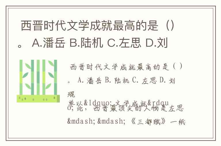 单以“文学成就”论,西晋最顶尖的人物是左思——《三都赋》一纸风行、洛阳纸贵,钟嵘《诗品》列其诗于“上品”,史家亦公认其赋体与五言诗均为太康之冠冕。故选: