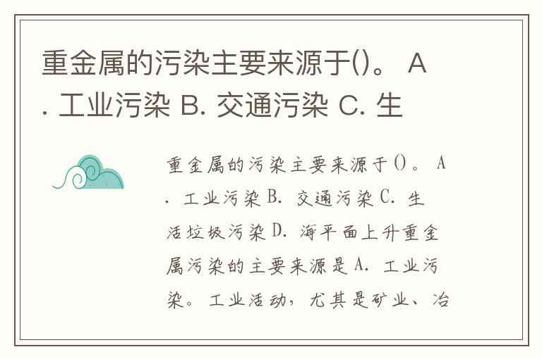 重金属的污染主要来源于()。 A. 工业污染 B. 交通污染 C. 生活垃圾污染 D. 海平面上升