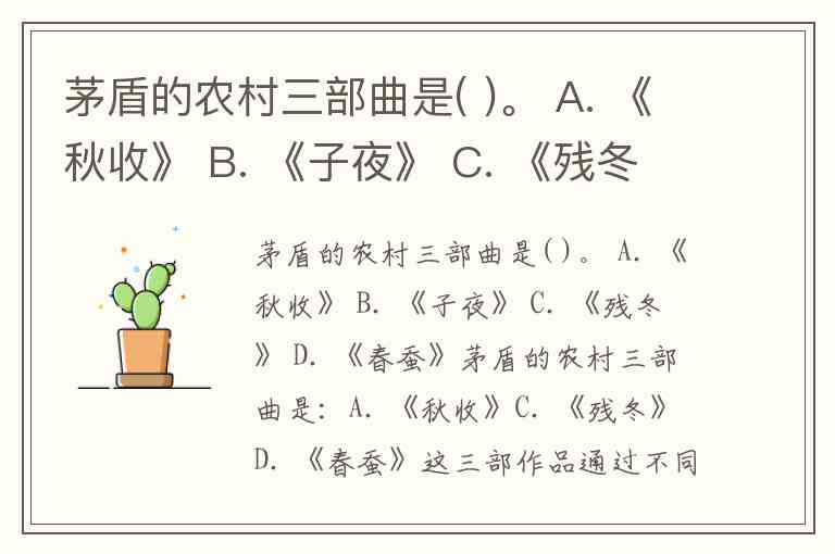 茅盾的农村三部曲是( )。 A. 《秋收》 B. 《子夜》 C. 《残冬》 D. 《春蚕》