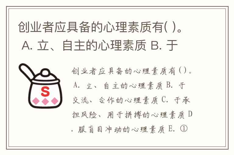 这些都是创业者在创业过程中非常重要的心理素质。至于 D 项,“服盲目冲动的心理素质”,它并不是创业者应具备的素质,反而是应该避免的。