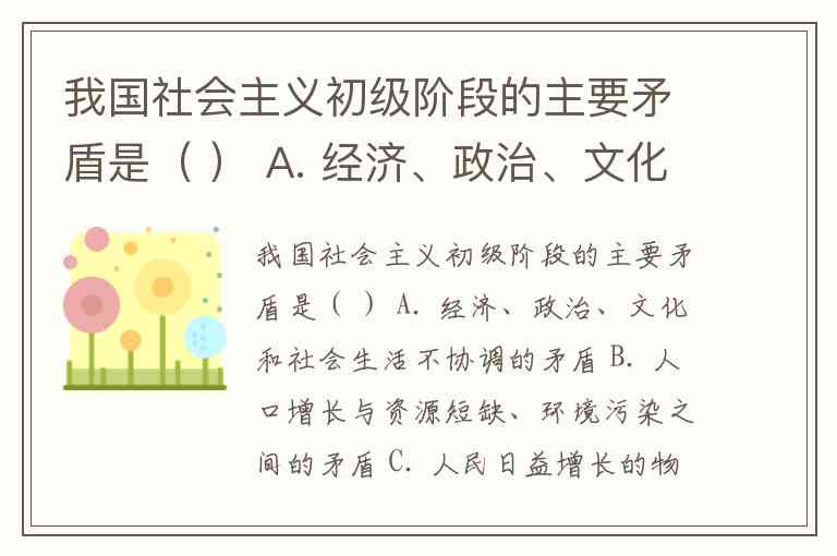我国社会主义初级阶段的主要矛盾是( ) A. 经济、政治、文化和社会生活不协调的矛盾 B. 人口增长与资源短缺、环境污染之间的矛盾 C. 人民日益增长的物质文化需要同落后的社会生产之间的矛盾 D. 现代化的大城市与落后的农村之间的矛盾