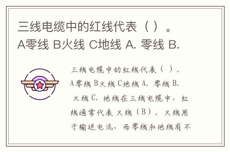 在三线电缆中,红线通常代表 火线(B)。火线用于输送电流,而零线和地线有不同的作用:零线一般是蓝色,地线通常是黄绿相间的颜色。