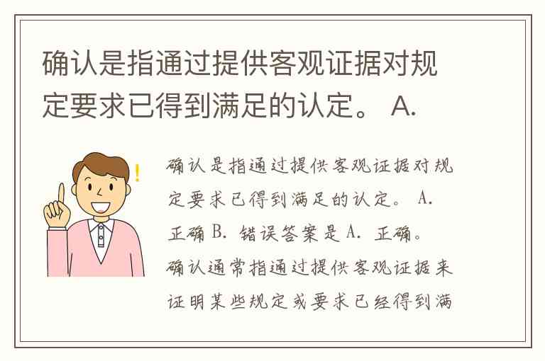 确认通常指通过提供客观证据来证明某些规定或要求已经得到满足的过程。这是一个重要的验证手段,用于确保某些标准或要求已经被遵循或实现。