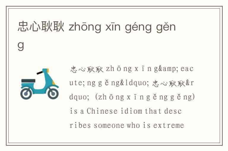 “忠心耿耿” (zhōng xīn gěng gěnɡ) is a Chinese idiom that describes someone who is extremely loyal, devoted, or steadfast in their loyalty, especially to a person, cause, or belief. It’s often used to praise someone for their unwavering dedication or commitment. The phrase is generally associated with deep sincerity and faithfulness.