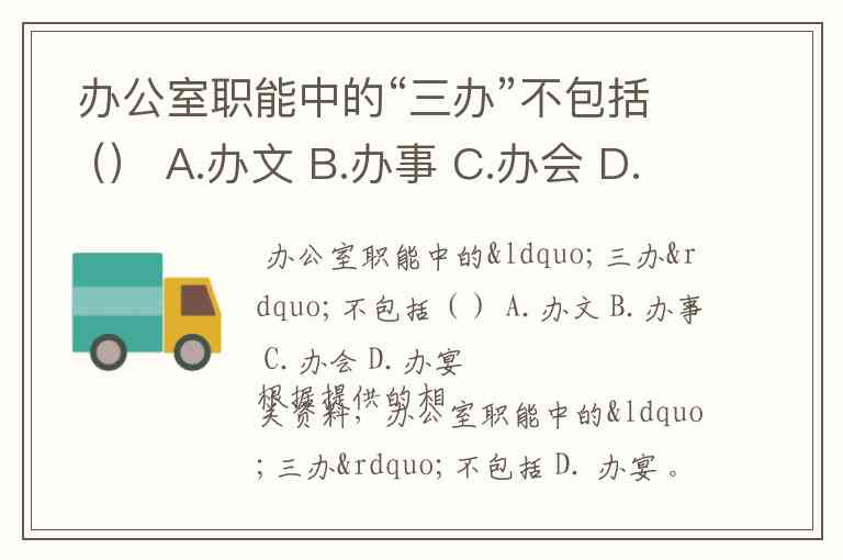 办公室职能中的“三办”不包括() A.办文 B.办事 C.办会 D.办宴