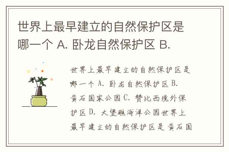 世界上最早建立的自然保护区是哪一个 A. 卧龙自然保护区 B. 黄石国家公园 C. 赞比西境外保护区 D. 大堡礁海洋公园