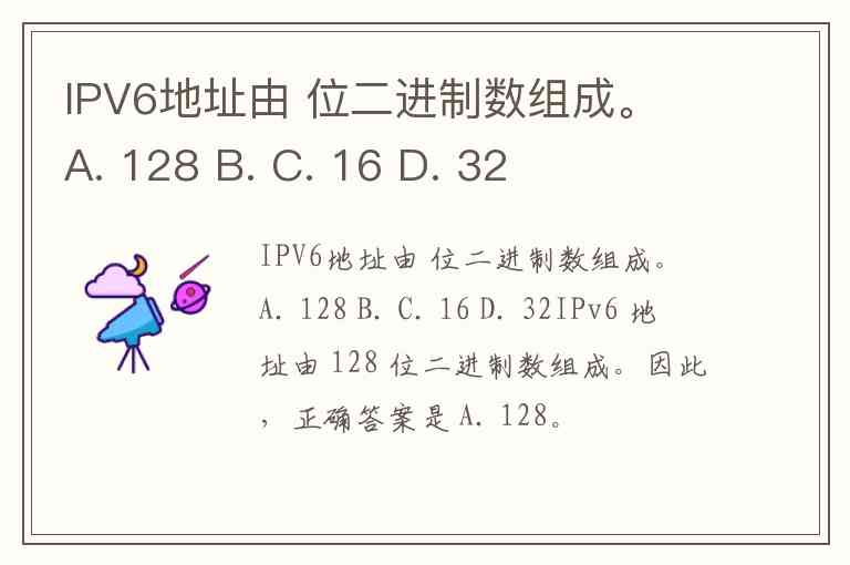 IPV6地址由 位二进制数组成。 A. 128 B. C. 16 D. 32