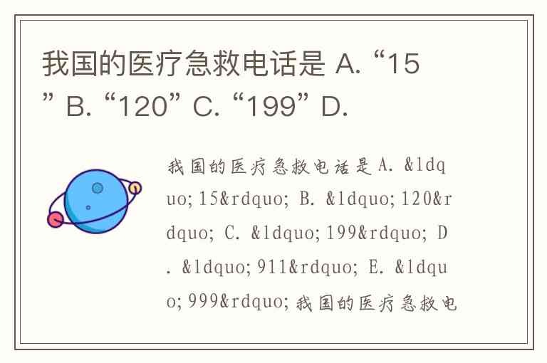 我国的医疗急救电话是 A. “15” B. “120” C. “199” D. “911” E. “999”