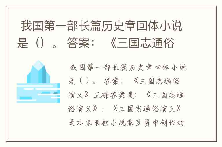 《三国志通俗演义》是元末明初小说家罗贯中创作的长篇章回体历史演义小说,它被公认为中国文学史上第一部长篇章回体小说,也是历史演义小说的开山之作。这部小说后来更为人熟知的名字是《三国演义》。