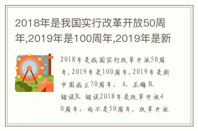 2018年是改革开放40周年,而不是50周年。改革开放始于1978年,所以2018年是改革开放40周年。2019年是新中国成立70周年,这个是正确的。