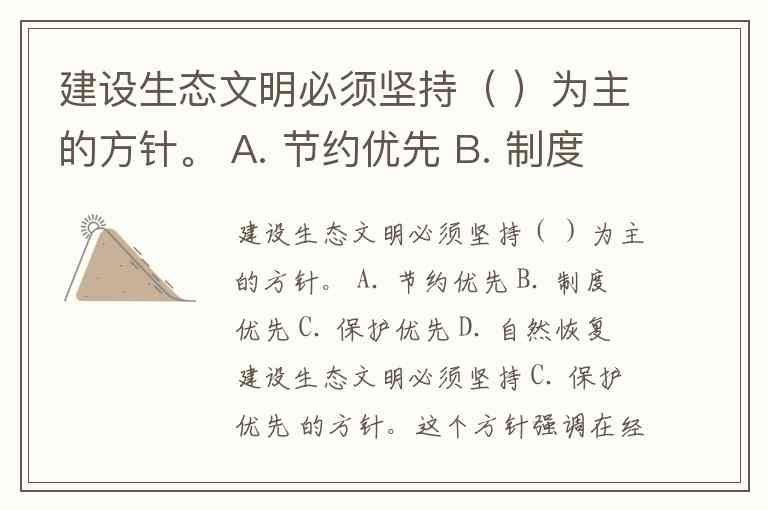 建设生态文明必须坚持( )为主的方针。 A. 节约优先 B. 制度优先 C. 保护优先 D. 自然恢复