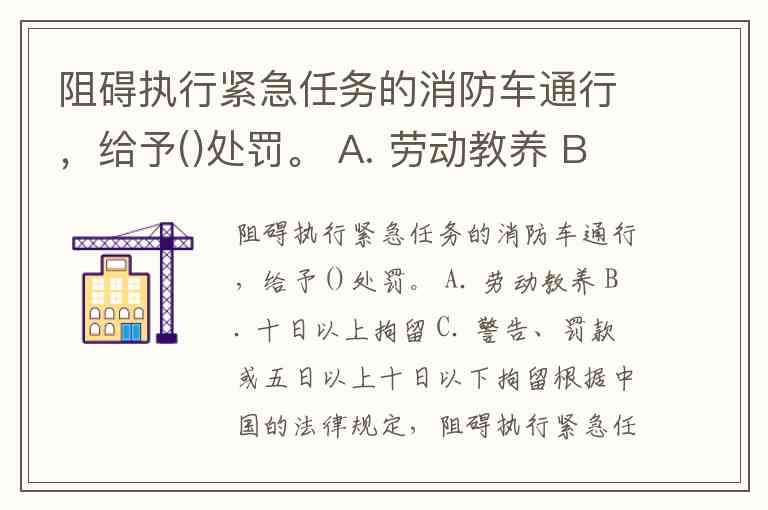 阻碍执行紧急任务的消防车通行,给予()处罚。 A. 劳动教养 B. 十日以上拘留 C. 警告、罚款或五日以上十日以下拘留