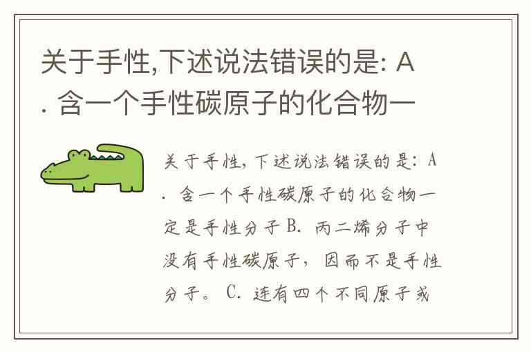 关于手性,下述说法错误的是: A. 含一个手性碳原子的化合物一定是手性分子 B. 丙二烯分子中没有手性碳原子,因而不是手性分子。 C. 连有四个不同原子或基团的碳原子称为手性碳原子 D. 手性是产生对映异构现象的必要条件